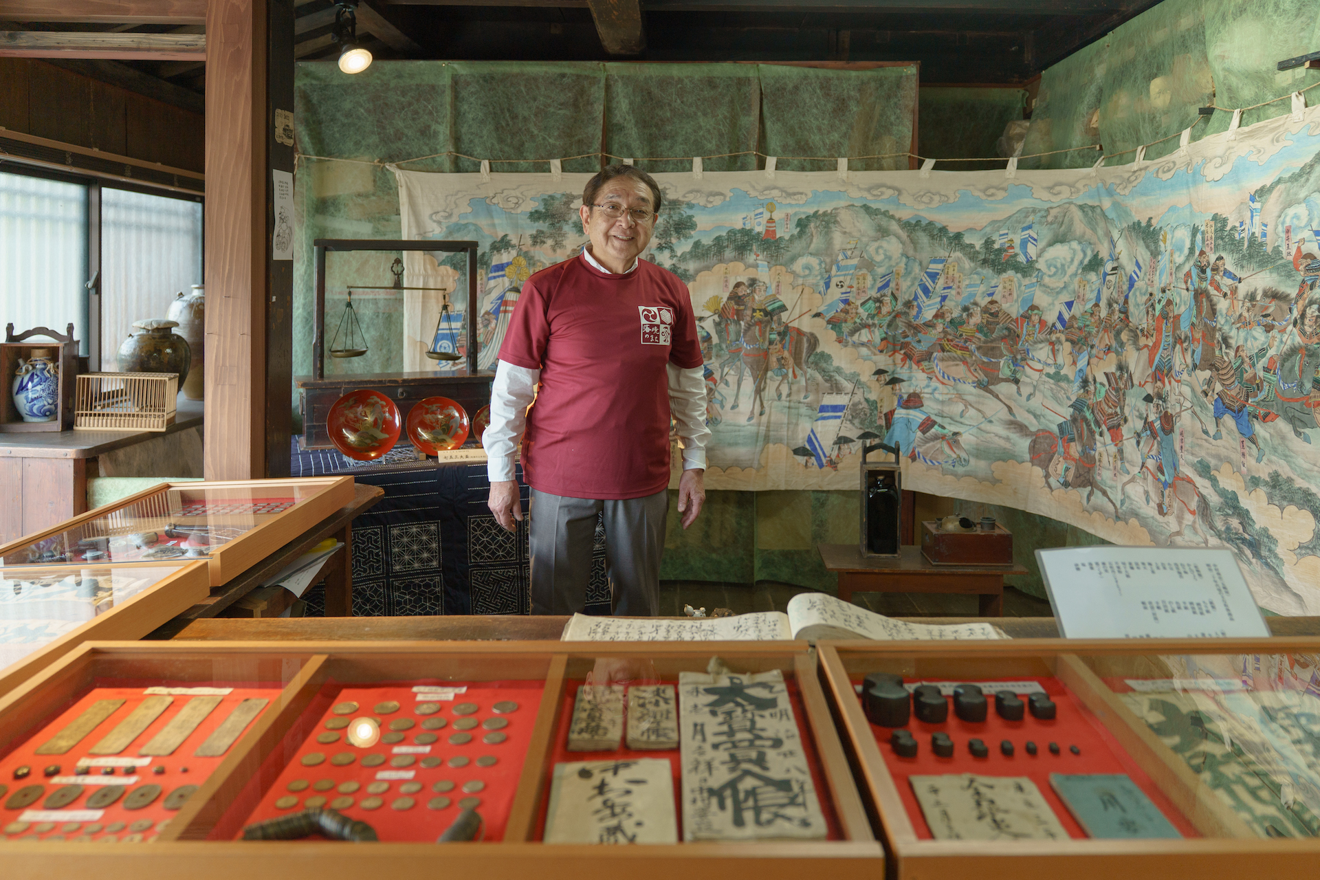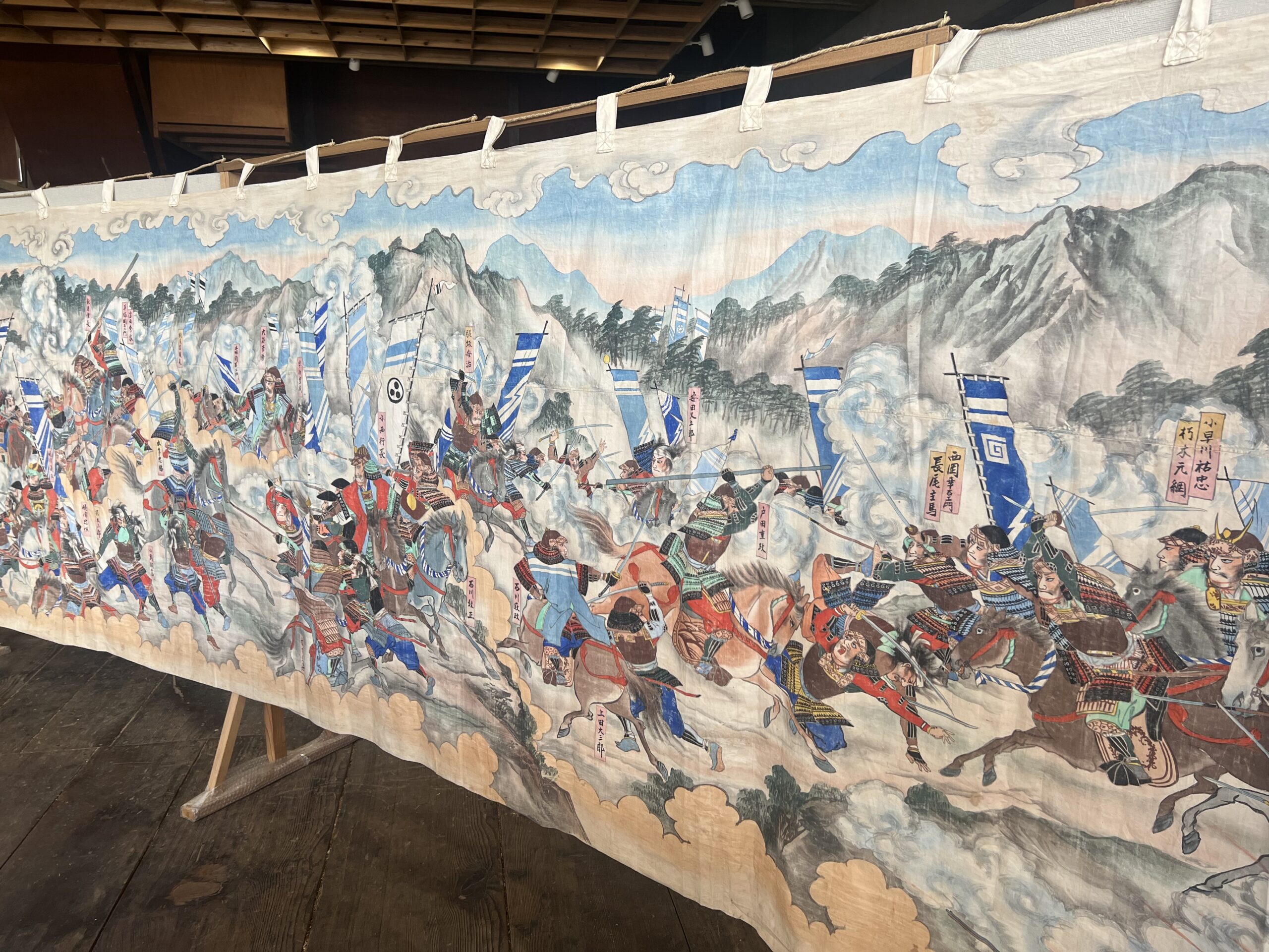 코보·에노키즈 번경의 마을 보존회의 나카무라 이사장이 운영하는 「나카무라 종이점」에서는 실제로 사용되었던 장부(대복장부)와 옛 화폐, 나카무라 가문의 6대 우키치(宇吉)가 태어난1922년에 만들어진 절기 장식막 등을 볼 수 있습니다. 1600년 세키가하라 전투가 10m에 걸쳐 그려진 막은, 70명 이상의 무장이 등장하는 압도적인 작품으로, 실제로는 집 주변에 둘러 전시했다고 합니다. 건강하게 자라는 것을 바라는 부모의 소원이 이러한 훌륭한 형태로 표현되어 있습니다.