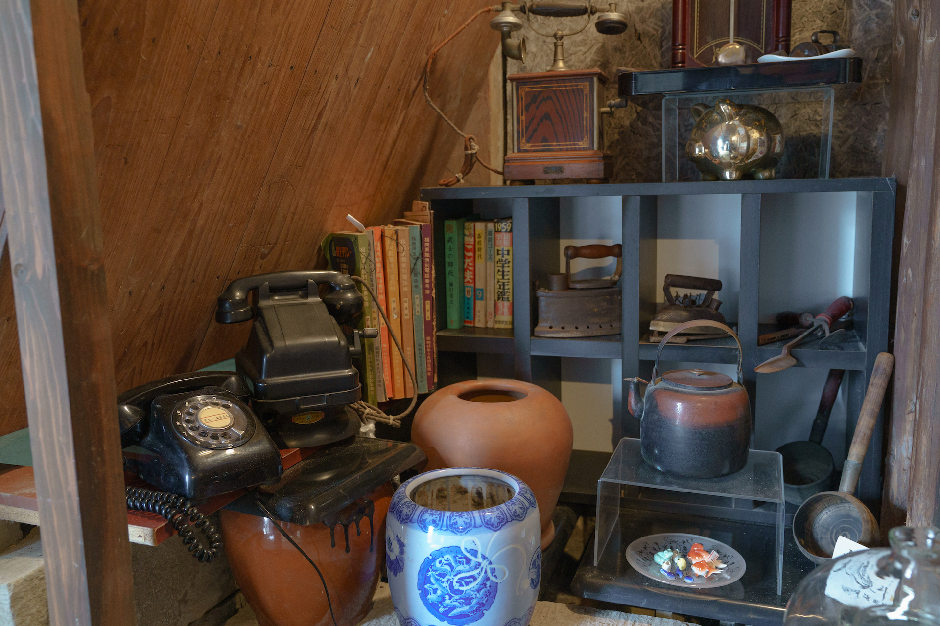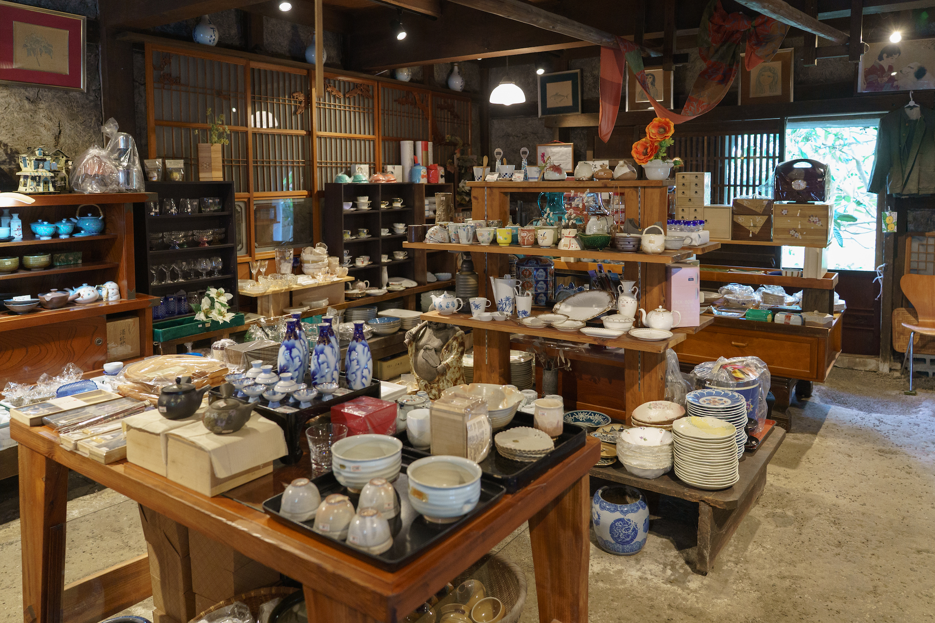 평소에는 닫혀 있는 창고 안에는 아리타 도자기와 일본식 도자기, 앤티크 잡화, 쇼와 시대 레트로 상품이 진열되어 있습니다. 적당한 가격으로 매우 즐거운 쇼핑의 시간을 즐길 수 있습니다. 번경 축제 때에는 2층에는 투구가 전시되어 있었습니다.