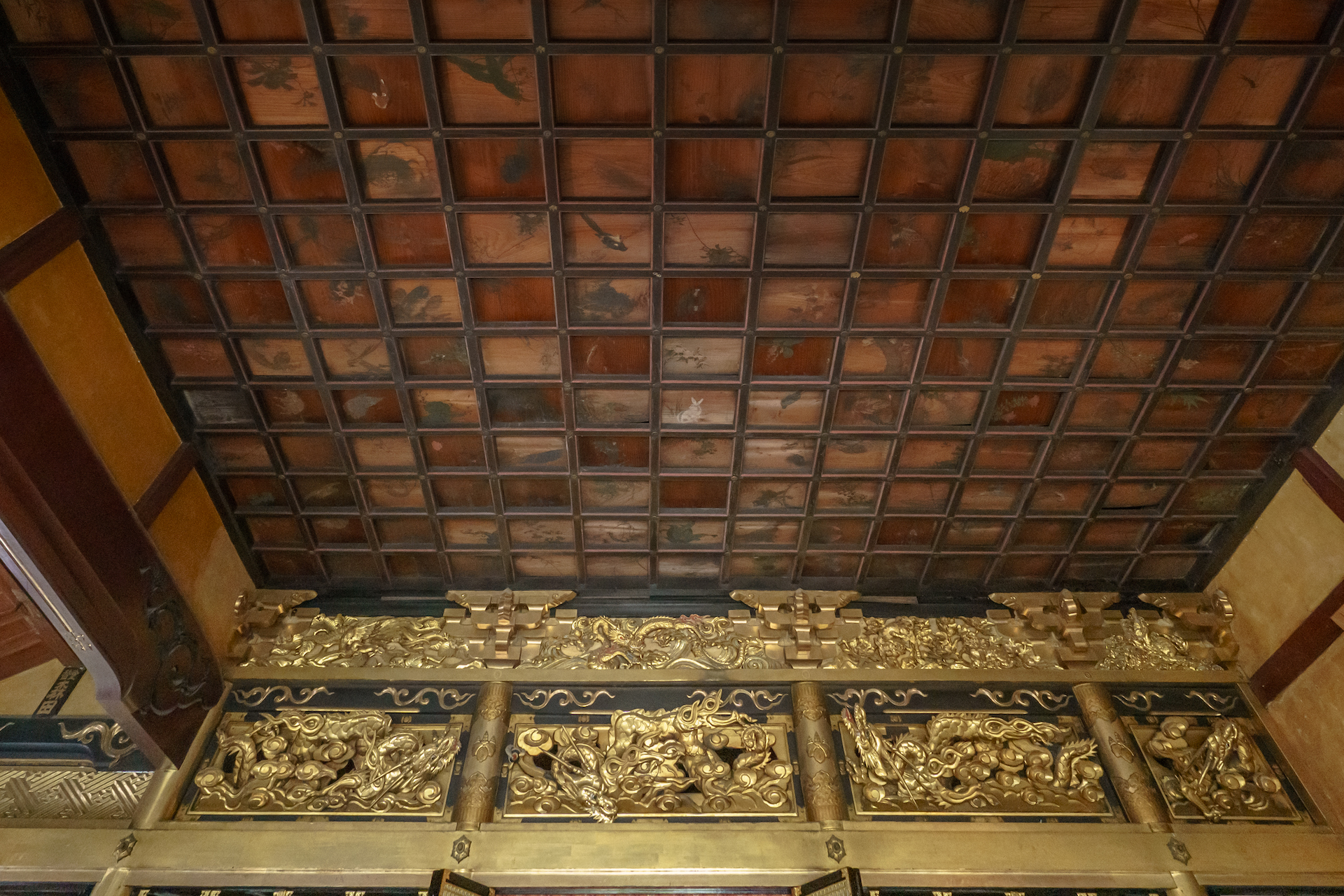 평소에는 들어갈 수 없는 곳이 개방되는 것은 문화재만이 아닙니다. 번경 축제 당일에는 보통 단가(사찰 신도)만 들어갈 수 있는 절도 견학할 수 있습니다. 1624년에 옛 야나가와 번주 다치바나 무네시게에 의해 지어지고, 1847년에 재건되었다고 전해지는 고라쿠지에는 본당 천장에 동물, 식물, 인물이 그려진 판화가 무려 163장이 있습니다.